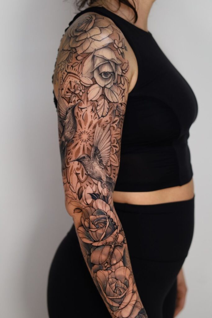 This intricately detailed floral tattoo by “ami.tats” incorporates roses, hummingbirds, and ornamental designs, creating a delicate yet visually stunning sleeve.