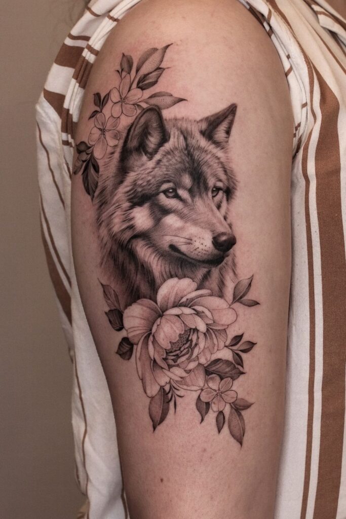 This realistic wolf tattoo sleeve by “rachaelsawtelltattoo” is a symbol of loyalty, intuition, and strength, beautifully paired with floral elements that add a touch of grace and femininity.