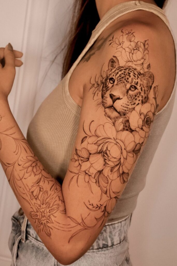 This breathtaking tattoo sleeve by “diegoaugustoart” combines the powerful image of a jaguar with delicate floral accents, symbolizing strength, intuition, and feminine power.