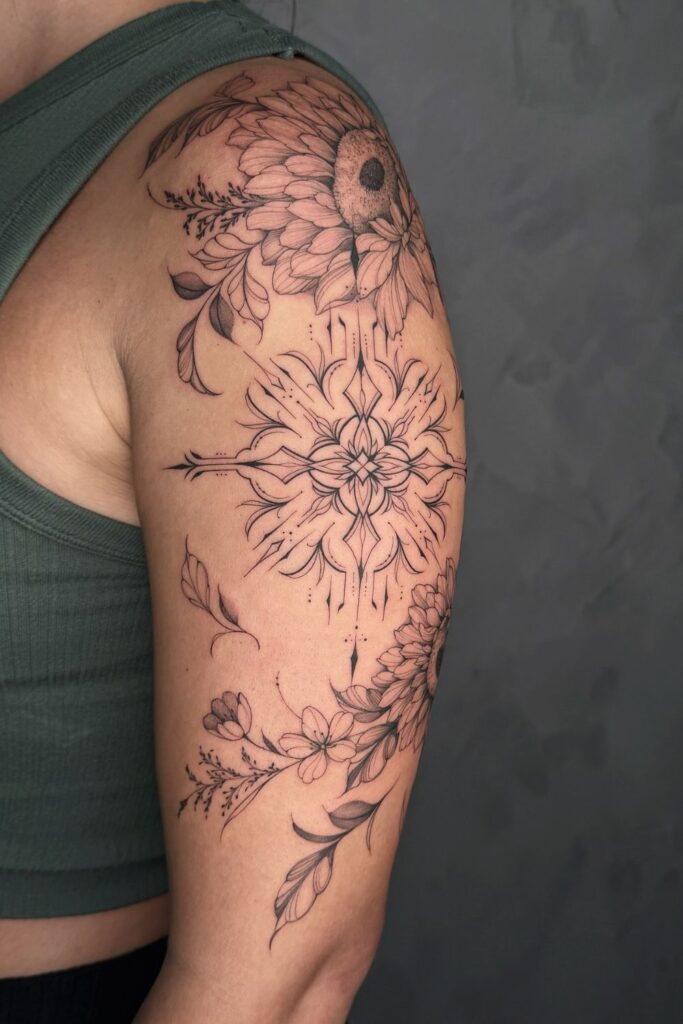 A graceful tattoo that combines a large sunflower with geometric mandala elements by “gabriela.tattoo“, this design radiates positivity, warmth, and personal strength.