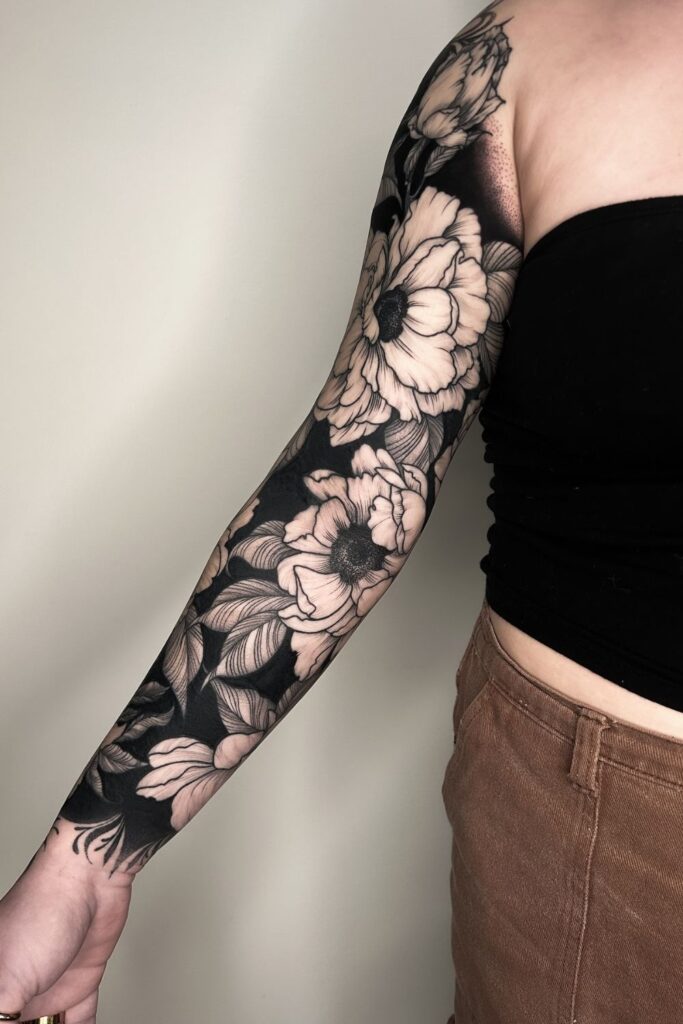 This striking sleeve tattoo by “crystal.thornss” contrasts dark blackout areas with soft, beautifully detailed floral patterns.