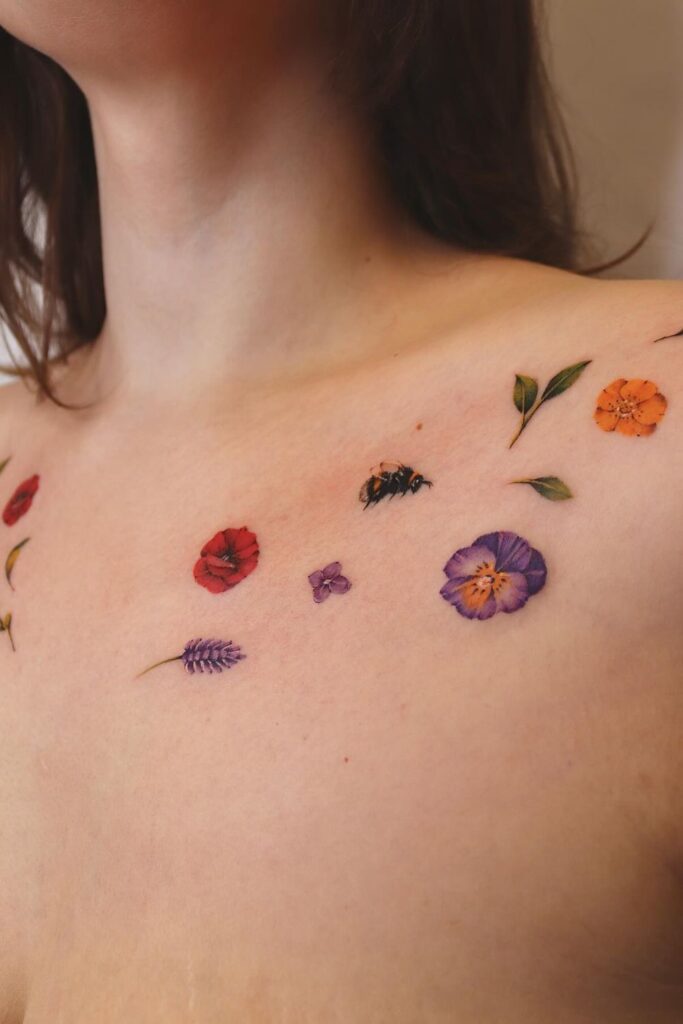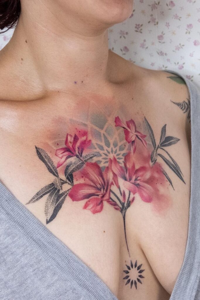 The subtle pops of color make it a unique women chest tattoo classy option, ideal for those who love delicate details.