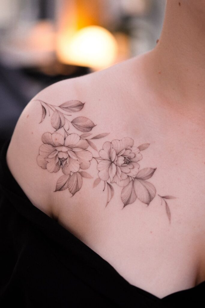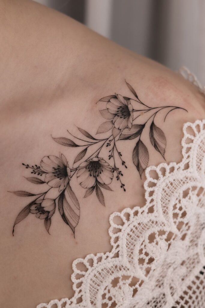 A masterpiece of botanical artistry, this floral tattoo gracefully follows the curve of the shoulder.