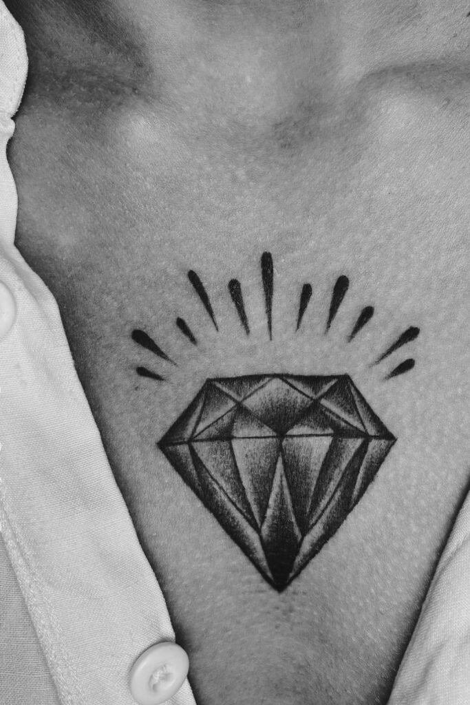 This striking geometric chest tattoo female design features a bold black-ink diamond, symbolizing strength and resilience.