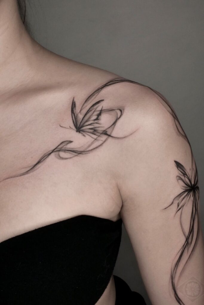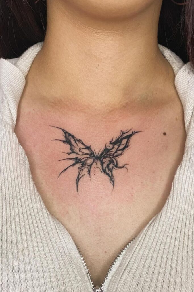 This chest butterfly tattoo blends delicate, flowing lines with a soft, artistic touch, creating an ethereal effect.