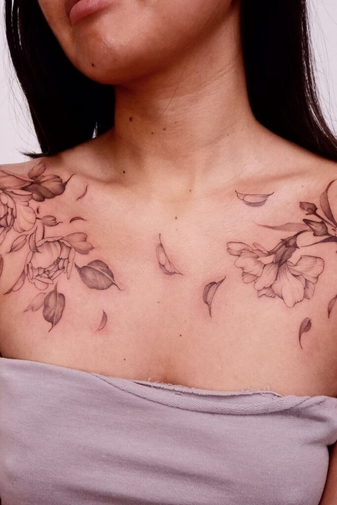 Perfect for those who love dainty chest tattoo female designs, this style is ideal for women who want a feminine chest tattoo that feels light, airy, and full of movement.