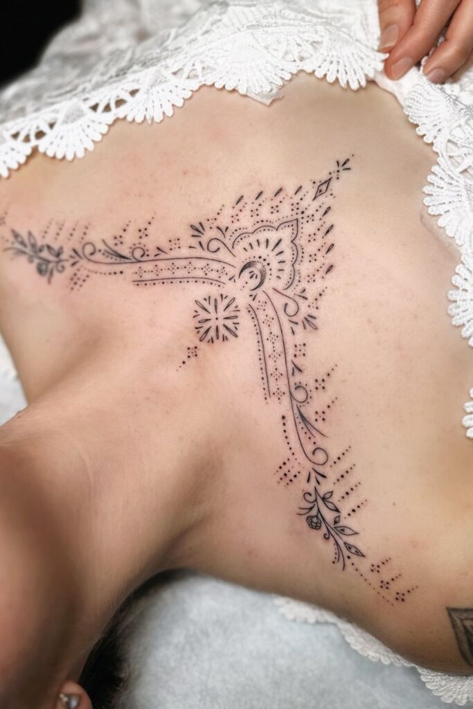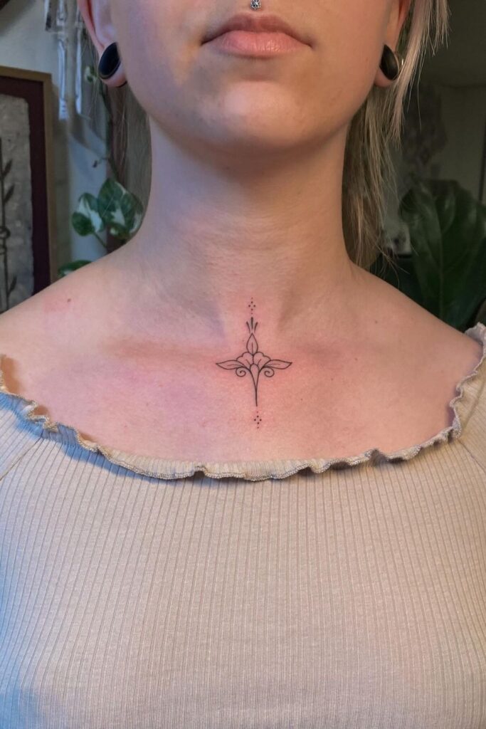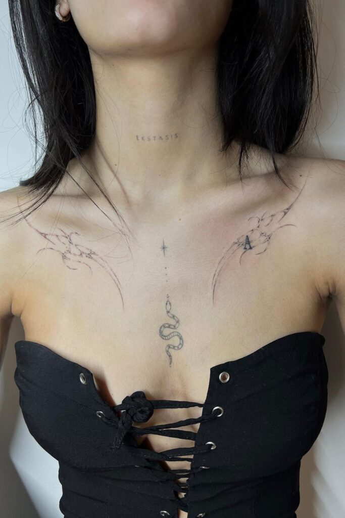 Best suited for women who love feminine chest tattoo for women styles that are subtle, elegant, and effortlessly chic.