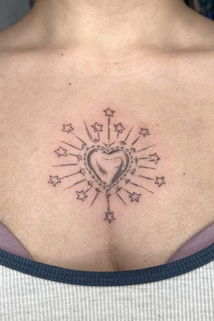 This cool chest tattoos for women design features a radiant sacred heart surrounded by celestial stars, symbolizing love and protection.