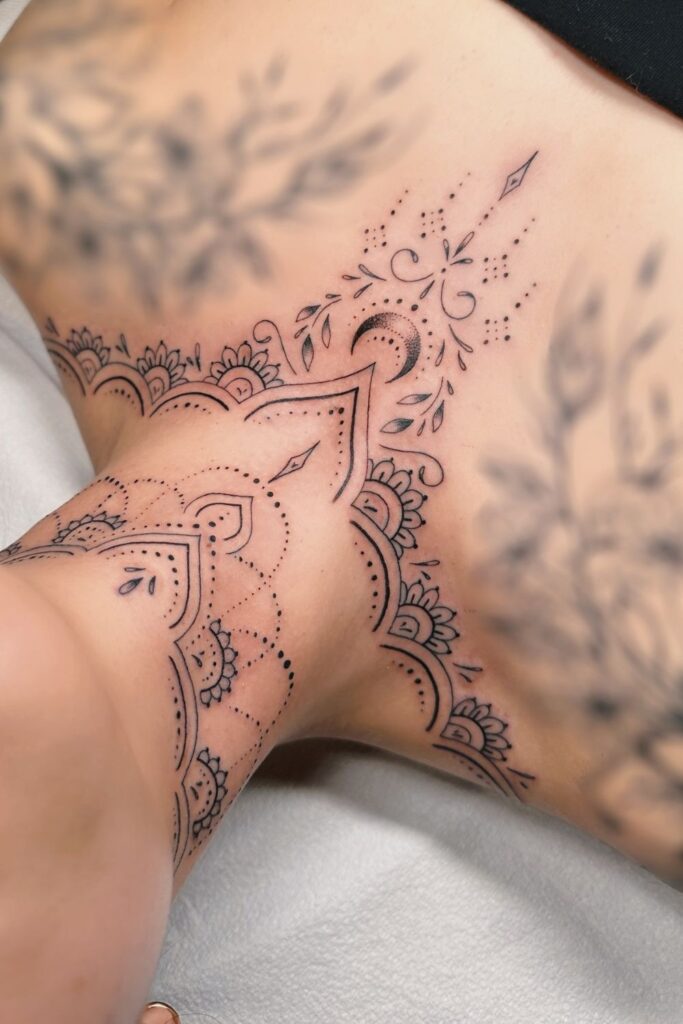 This ornamental tattoo chest women piece showcases intricate mandala-inspired detailing, creating a visually stunning effect.