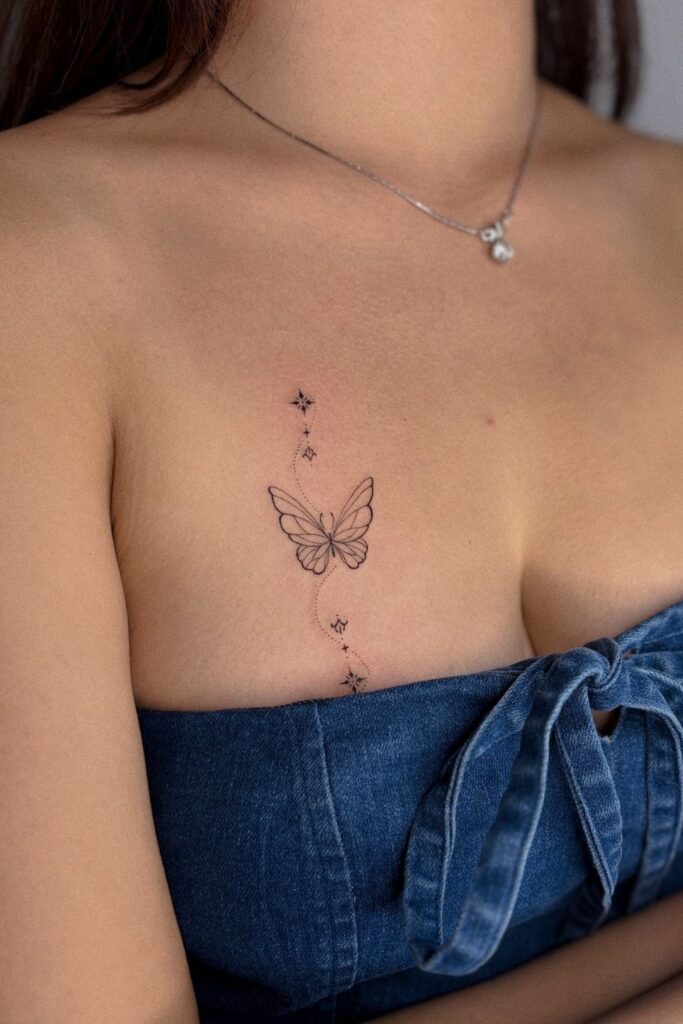 This feminine chest tattoo for women design showcases a fine-line butterfly surrounded by delicate star trails, giving it a dreamy and celestial feel.