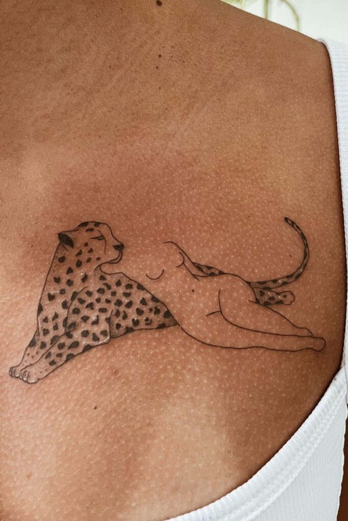 Symbolizing strength, independence, and harmony with nature, this minimalist tattoo beautifully merges a lounging leopard with a feminine form.