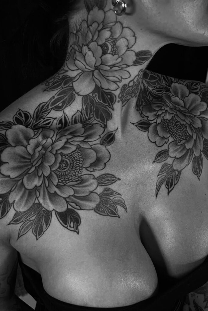 A stunning display of bold blackwork, this large floral tattoo extends from the chest to the neck, creating a striking and dramatic effect.