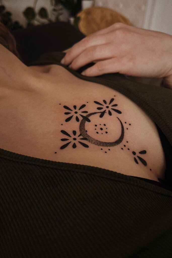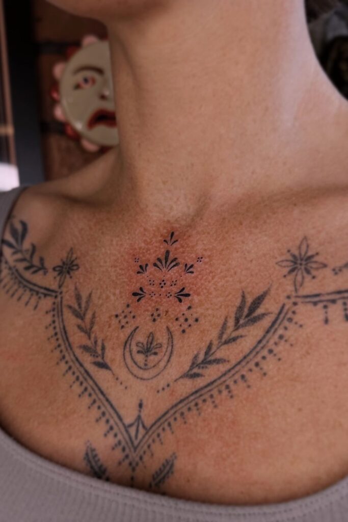 A stunning boho chest tattoo, this dot chest tattoo female combines celestial elements with floral details for a magical, enchanting effect.