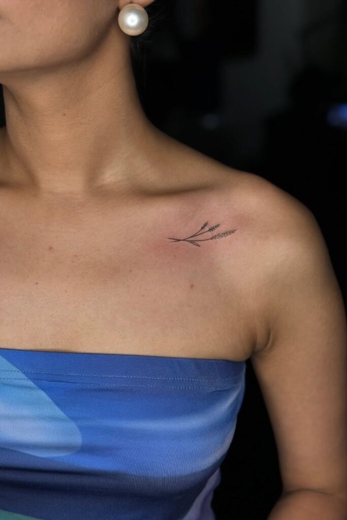 This delicate chest tattoo female design captures the beauty of nature with a minimalist wheat motif.