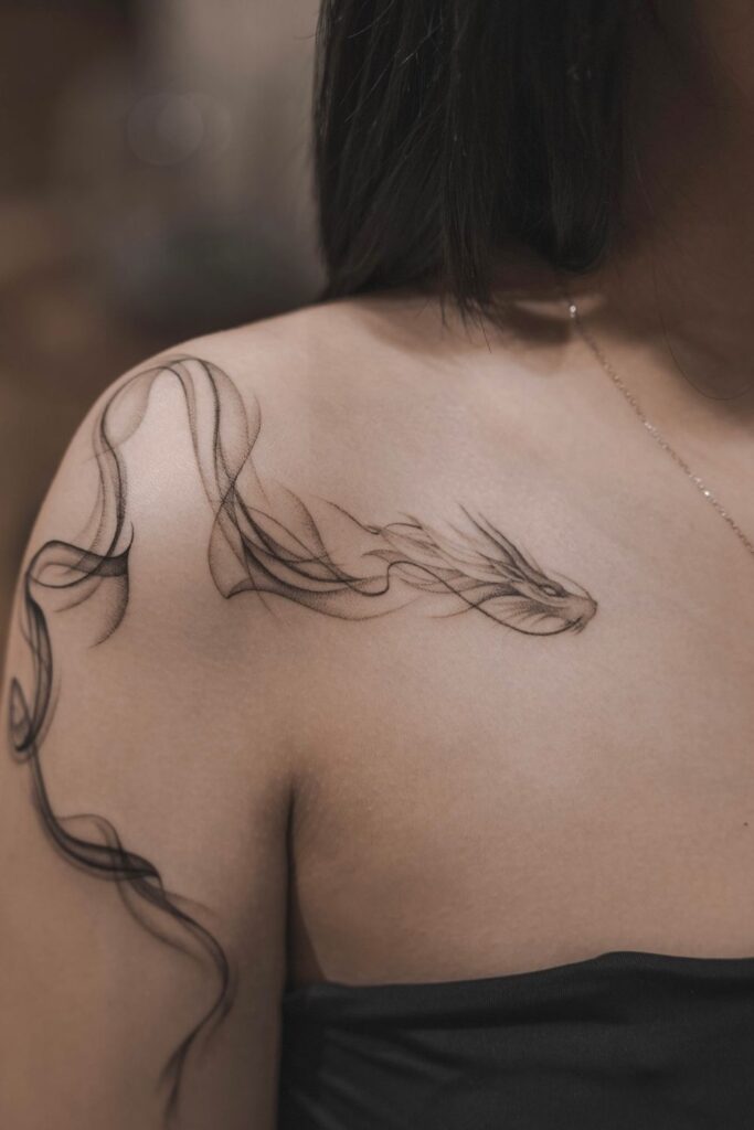 A stunning fusion of fantasy and minimalism, this dragon tattoo appears to emerge from wisps of smoke, gracefully wrapping around the shoulder.