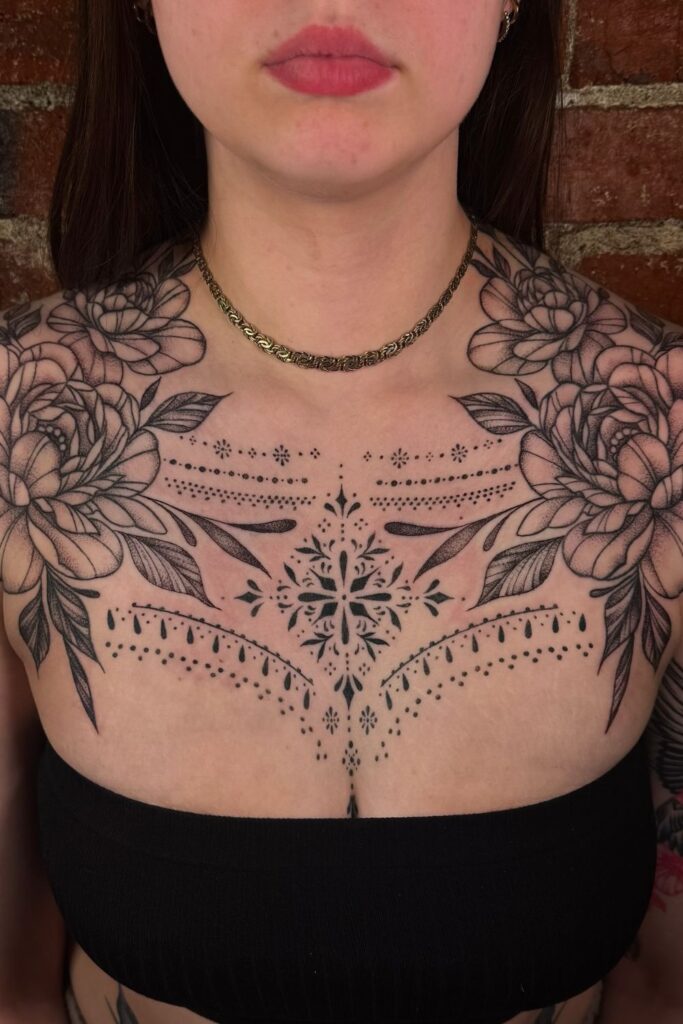 This breathtaking chest tattoo blends floral elegance with intricate ornamental detailing, creating a regal and feminine look.