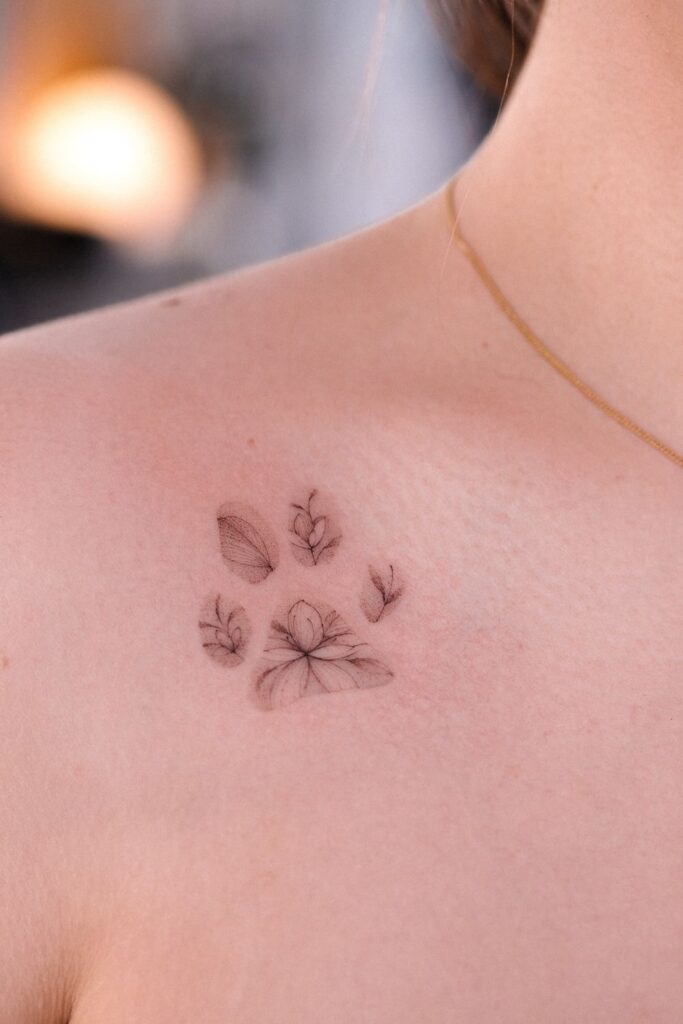 Combining a delicate chest tattoo female aesthetic with the love for animals, this tattoo on chest female design features a floral paw print.