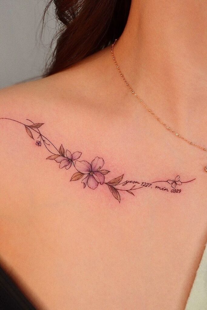 This delicate chest tattoo female features an elegant floral vine with a personal touch of fine script.