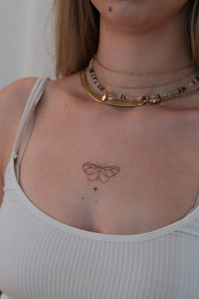 Simple yet captivating, this dainty chest tattoo female design features a fine-line butterfly with delicate stars, adding a touch of whimsy.