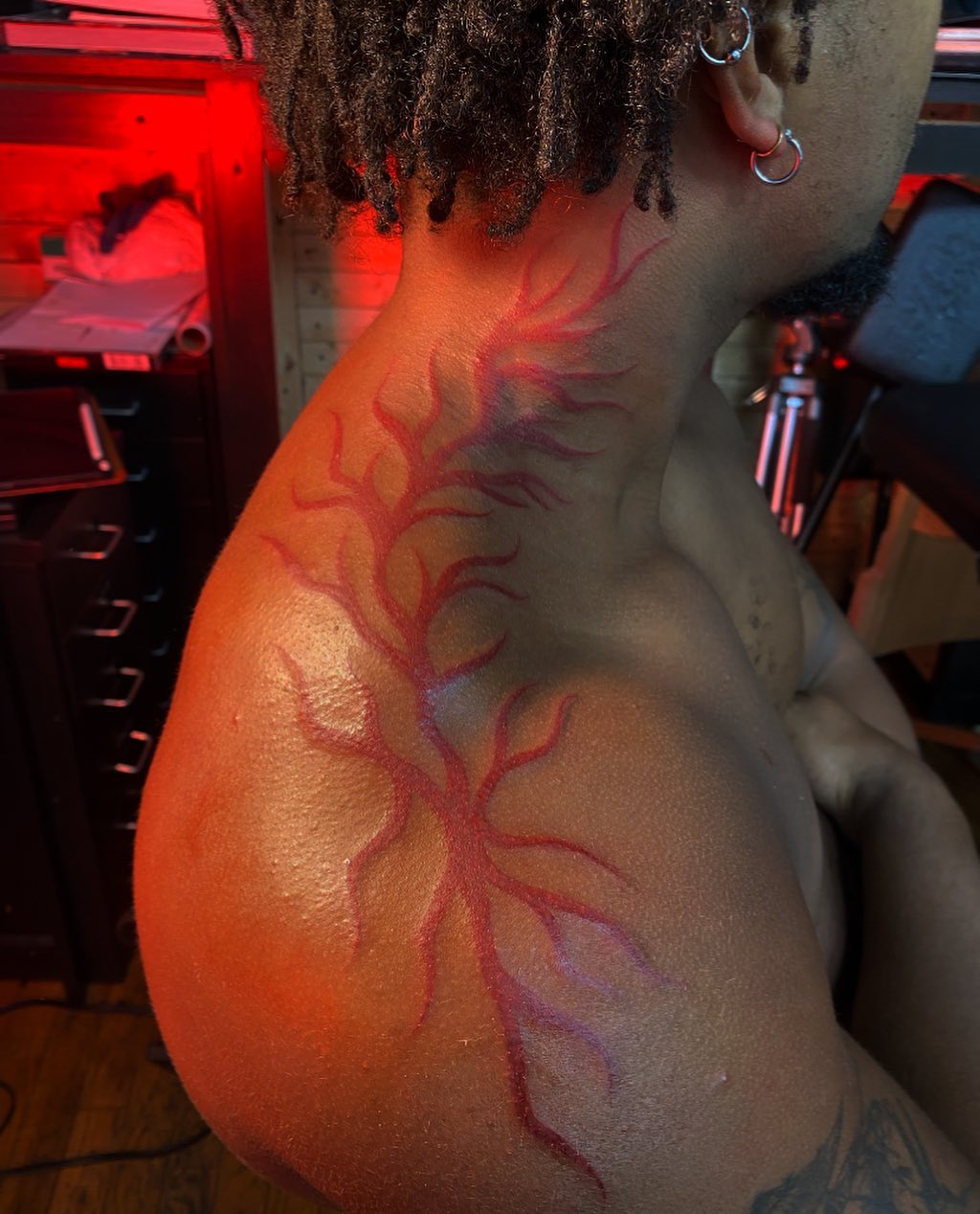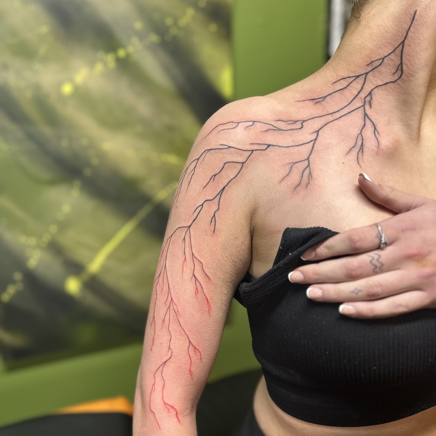 This image showcases a striking vein tattoo that beautifully wraps around the shoulder and arm, resembling intricate natural designs. The combination of black and red ink creates a vivid contrast that draws the eye, making the tattoo look almost alive. For those considering a similar design, remember to choose a skilled artist who can bring your vision to life with precision and creativity.