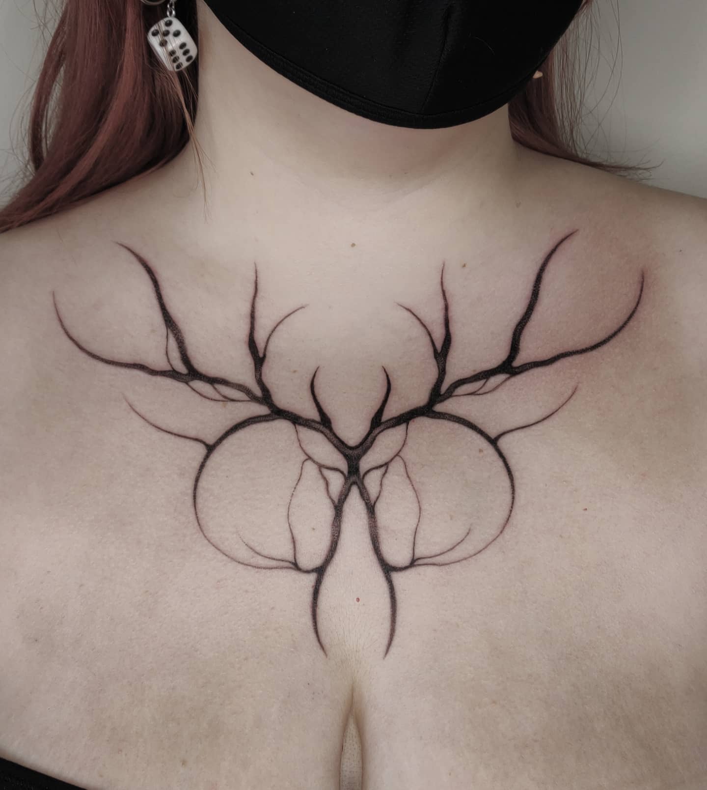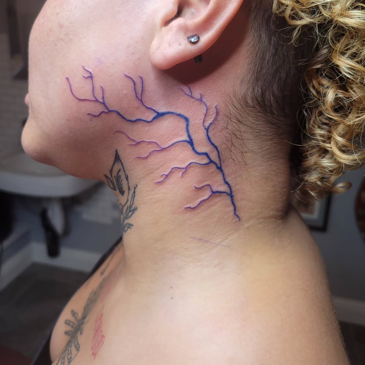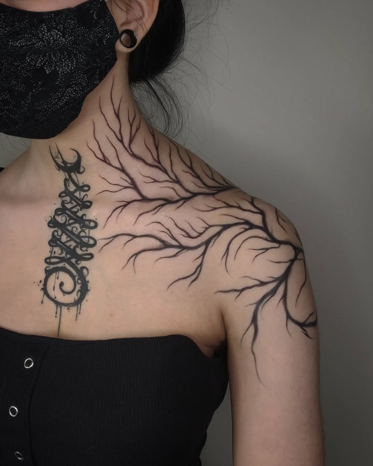 This striking tattoo features intricate designs that mimic the look of veins, flowing gracefully along the neck and shoulder. The delicate lines create a sense of movement, almost like branches reaching out. For those considering a similar design, opting for subtle colors can enhance the elegance and make the piece truly stand out.