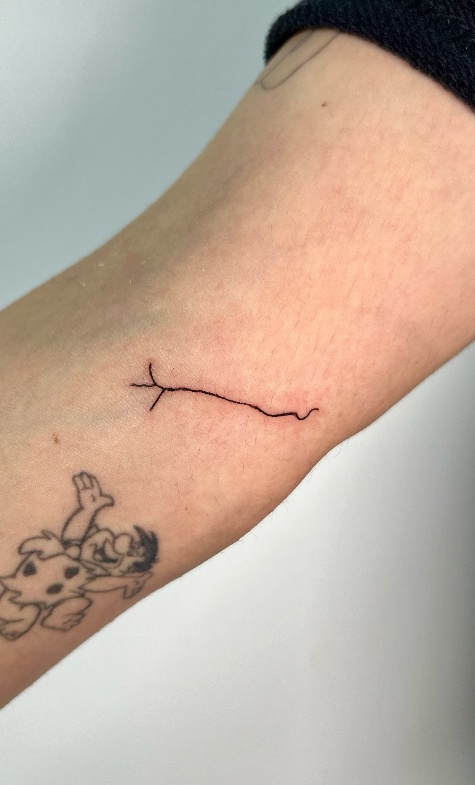 This unique tattoo features a delicate line that mimics the look of a vein, adding an artistic twist to body ink. Its subtle design makes a bold statement about individuality, blending seamlessly with a playful character tattoo nearby. For those considering a vein tattoo, choosing a location that complements your style can enhance its visual impact.