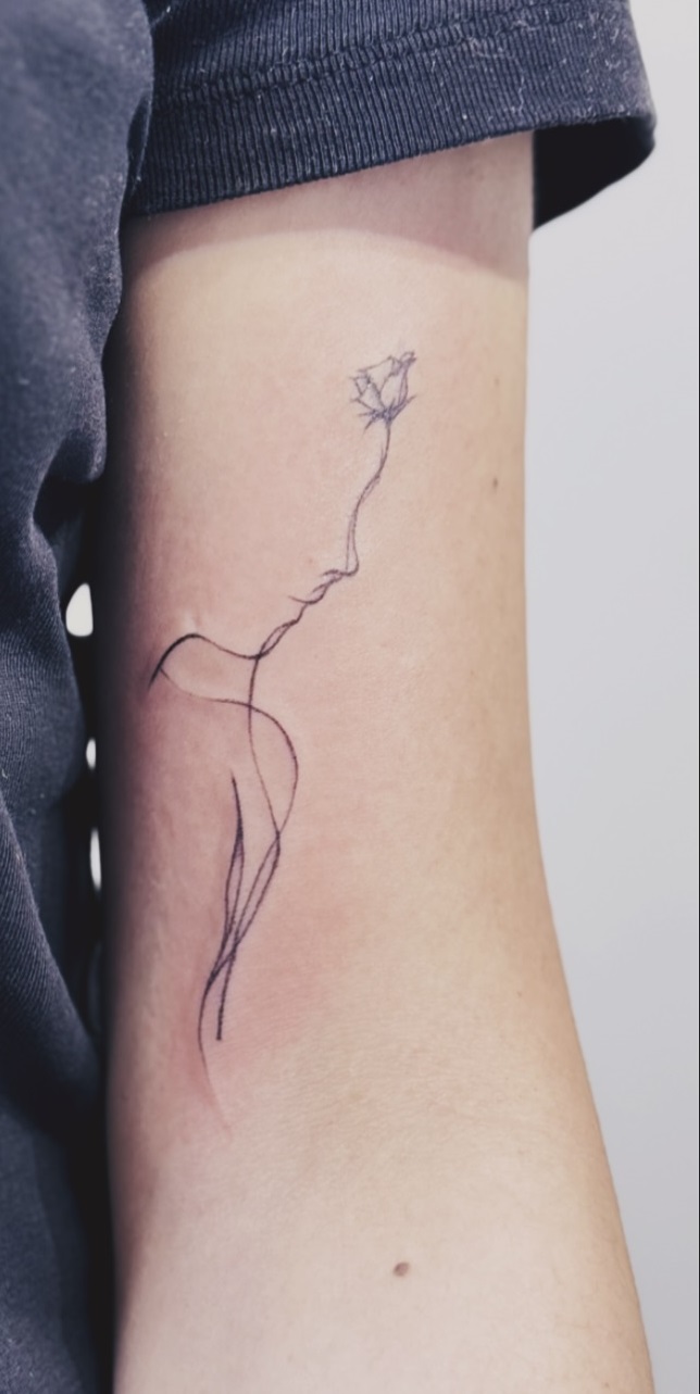 This tattoo features a beautiful, flowing design that combines the elegance of a flower with a graceful silhouette. The delicate lines create a sense of movement, making it a stunning piece of art that tells a story. Choosing a design that connects with personal feelings can make a tattoo even more meaningful.