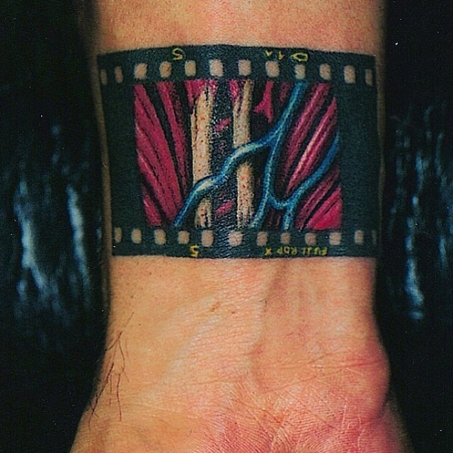 This striking tattoo showcases an eye-catching design that resembles a film strip, revealing vibrant veins beneath the skin. The combination of colors and detail makes it a true work of art, blending creativity with a touch of the human body s inner beauty. For those considering a similar tattoo, choosing a meaningful design can make it even more special.