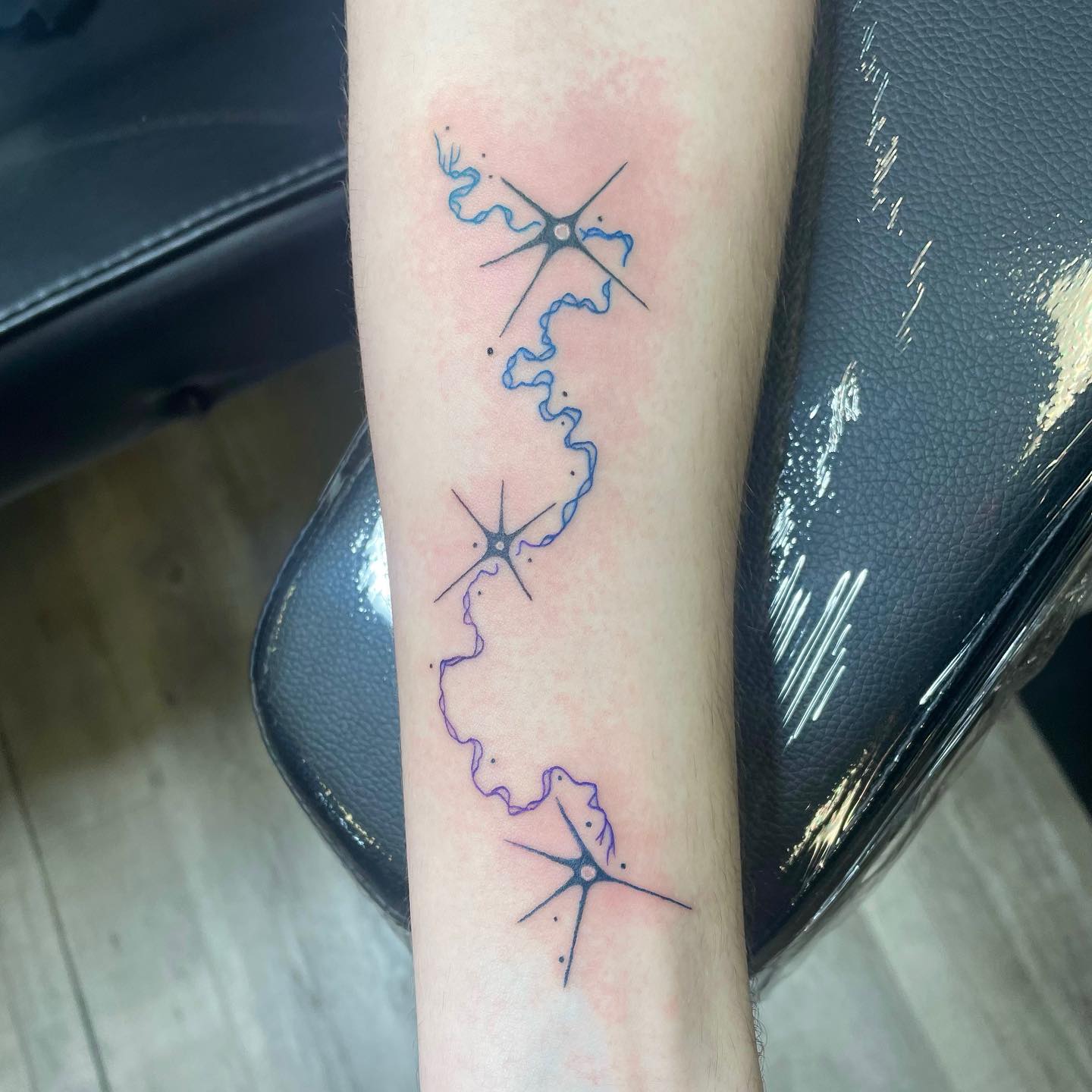 This tattoo stands out with its flowing, colorful design and striking star-like accents. The blend of blue and black creates a mesmerizing effect that draws the eye and sparks curiosity about its meaning. For those considering a unique tattoo, exploring different shapes and colors can result in a truly personal piece of art.