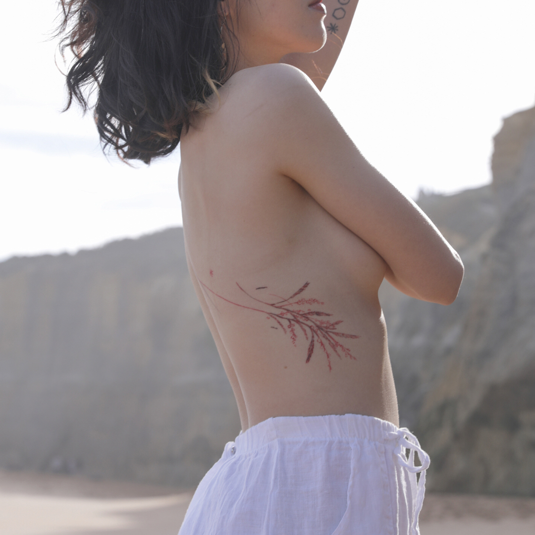 This image showcases a stunning tattoo that beautifully mimics the delicate lines of plant life. The soft colors and intricate design add a unique touch to the person s silhouette, making it a perfect blend of art and nature. Choosing a tattoo that reflects personal interests can create a deeper connection to the artwork.