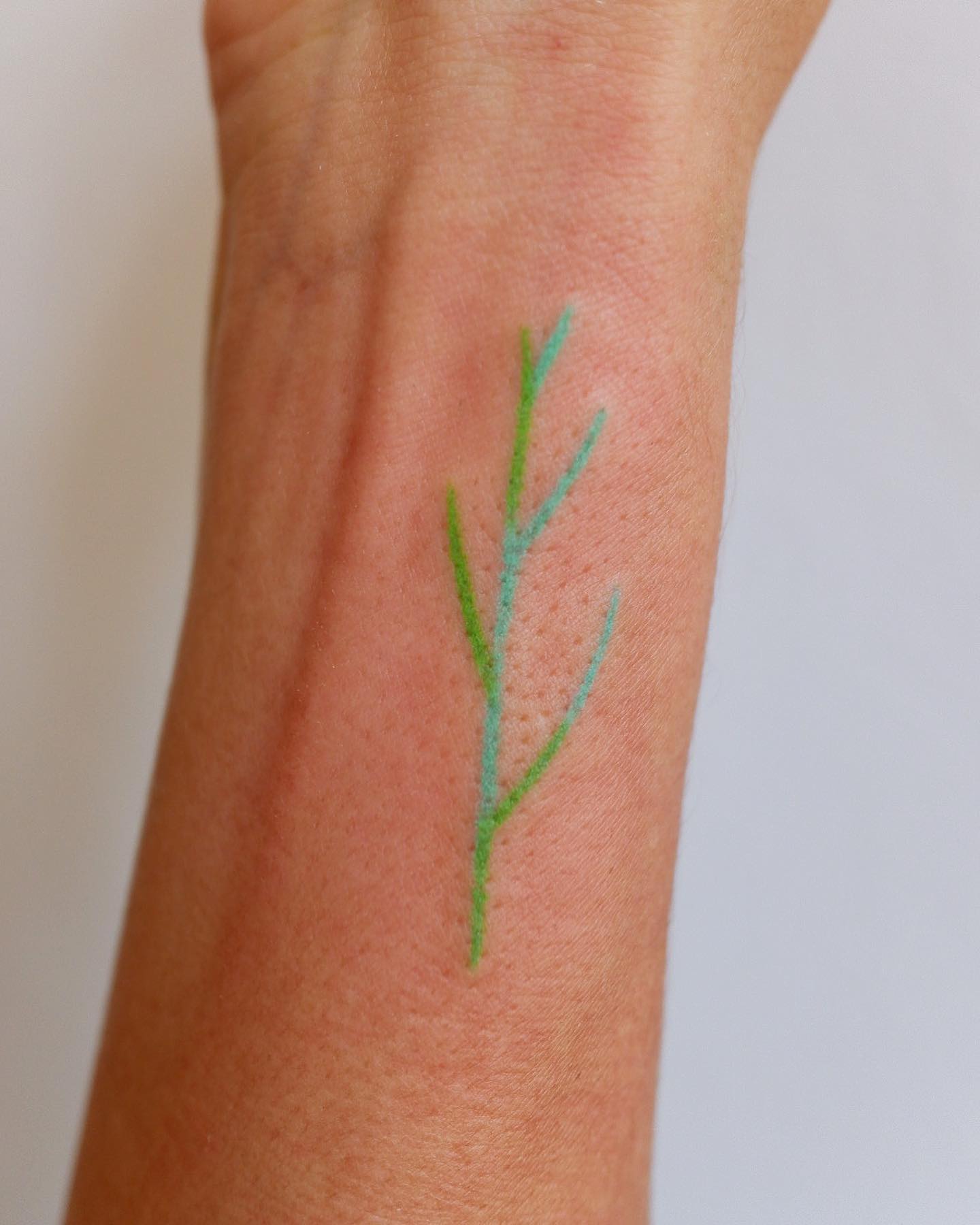 This image showcases a delicate, vine-like tattoo that adds a touch of nature to the skin. The soft green and blue hues create a serene vibe, making it a beautiful choice for those who appreciate subtle artistry. For anyone considering a similar design, think about how colors can enhance the overall look and personal meaning of your tattoo.