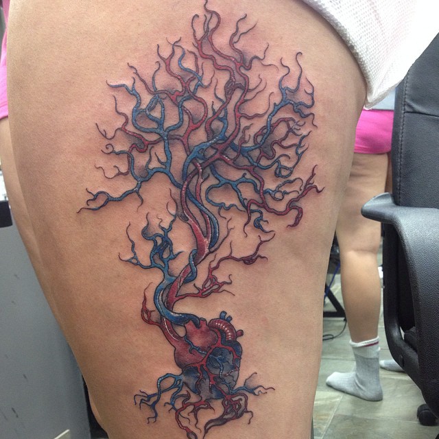 This image showcases a stunning tattoo that intricately blends the design of a heart with flowing veins, creating a unique visual impact. The vibrant colors and detailed artistry bring the piece to life, making it a conversation starter. For those considering a similar design, think about how personal elements can be incorporated to make the tattoo truly yours.