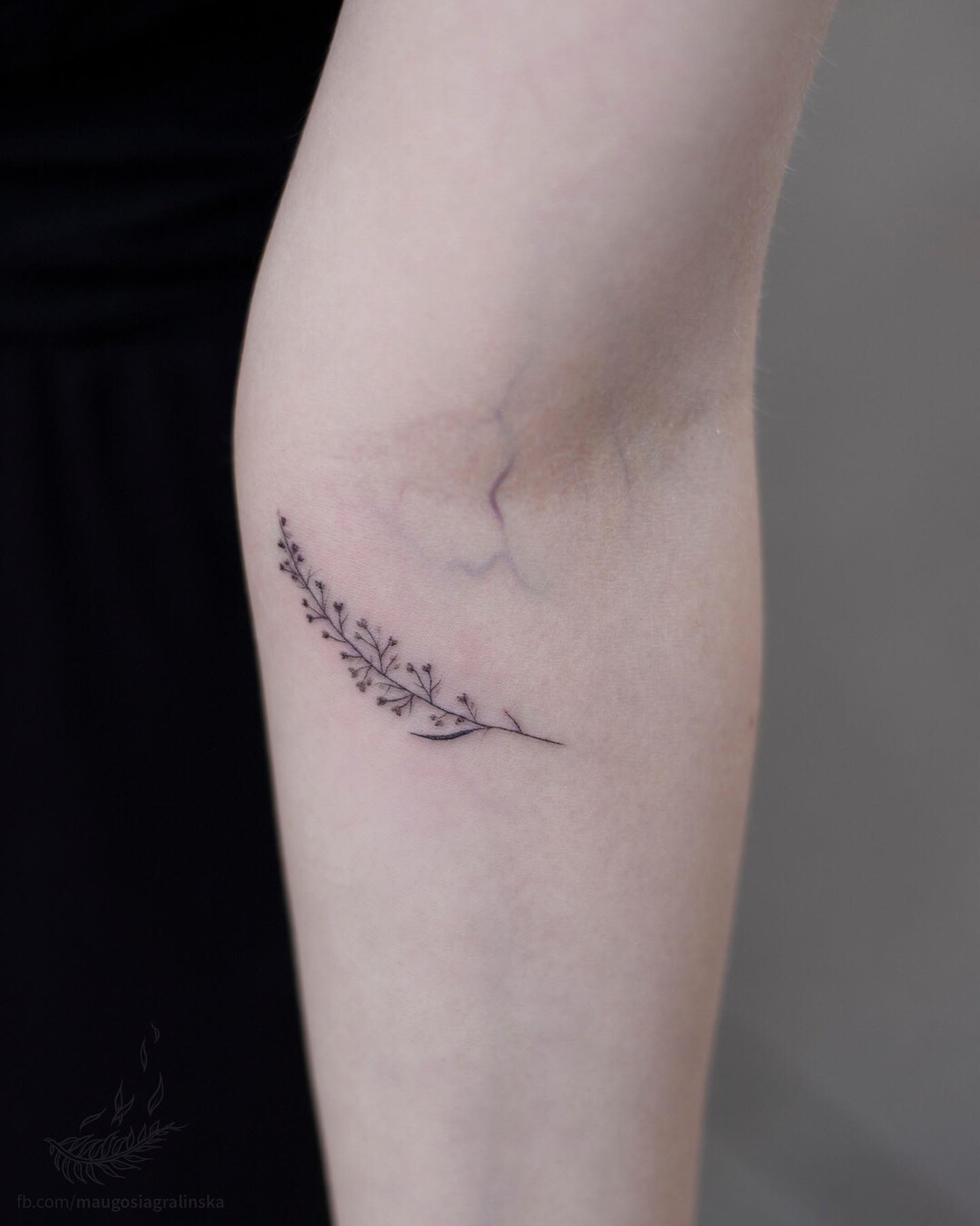 This striking image features a delicate floral tattoo that gracefully follows the natural curves of the arm. The gentle lines and soft details create a stunning contrast against the skin, emphasizing the beauty of both the tattoo and the person’s natural features. Choosing a design that complements one’s unique anatomy can make a tattoo truly special.
