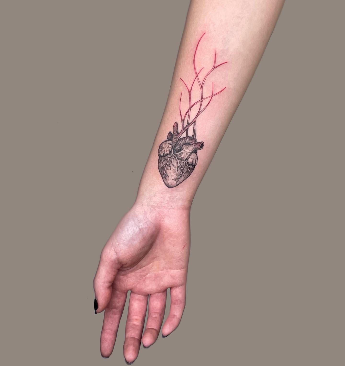 This striking tattoo features a beautifully detailed heart with vibrant, flowing veins extending outward. The blend of realism and artistry creates a unique visual that draws the eye and sparks curiosity. For those considering a similar design, think about how the colors can enhance the overall impact of your piece.