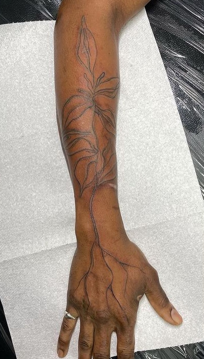 This tattoo showcases a beautiful blend of plant life and vein-like designs, creating a unique connection between nature and the human body. The intricate lines of the leaves and roots seem to flow seamlessly along the arm, making it a stunning piece of wearable art. For those considering a similar design, think about how personal symbolism can enhance the meaning behind your tattoo.
