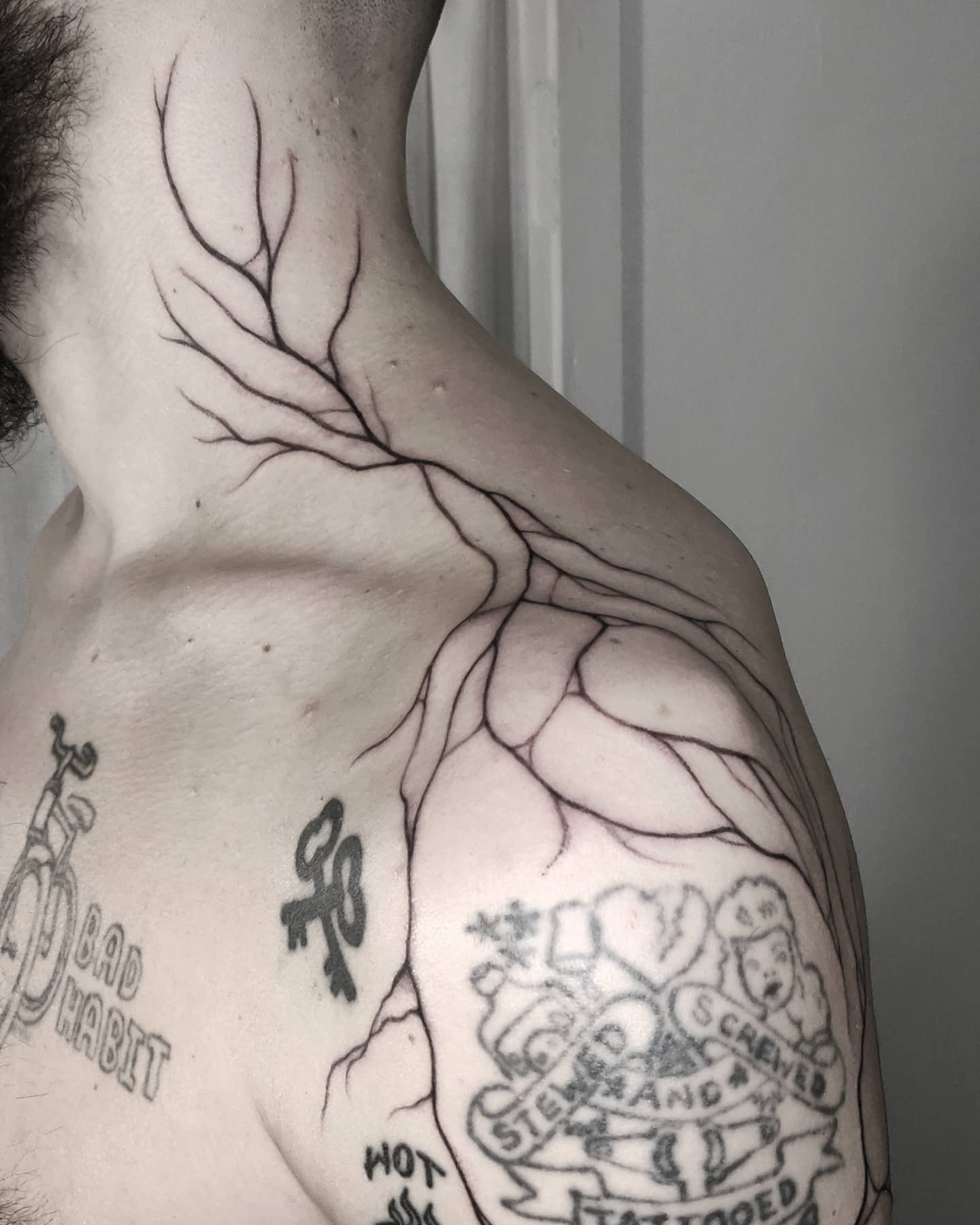 This striking tattoo design resembles intricate veins, creating a unique visual that stands out beautifully on the shoulder. The delicate lines and shading give the impression of a living artwork, drawing attention and sparking curiosity. For those considering a similar tattoo, choosing a location that allows for visibility can enhance its captivating effect.