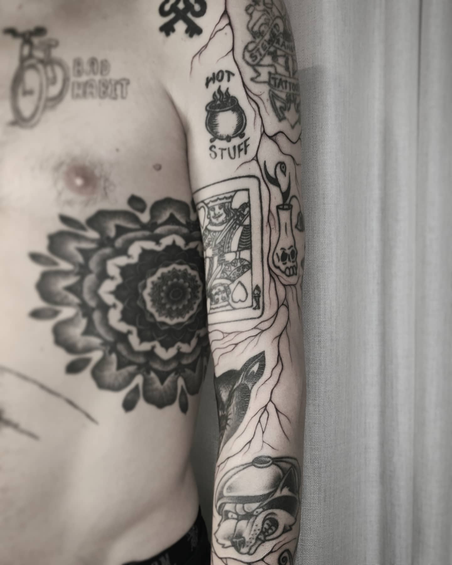 This image showcases a fascinating collection of tattoos that tell an intricate story on the skin. Each design, from the playful dog to the bold symbols, adds a layer of personality and history. For those considering their own ink, remember that every tattoo can symbolize a unique chapter in life.
