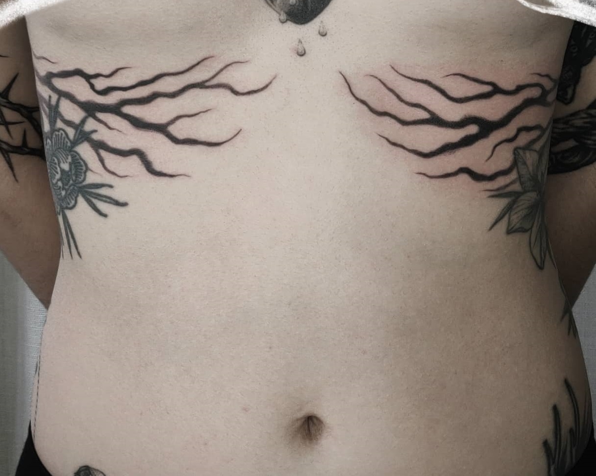 This stunning tattoo design resembles intricate branches, creating a unique visual on the skin. The flowing lines and shapes evoke a sense of organic beauty, making it a remarkable expression of artistry. For those considering a similar design, think about how the placement can enhance the natural curves of the body, creating a harmonious look.