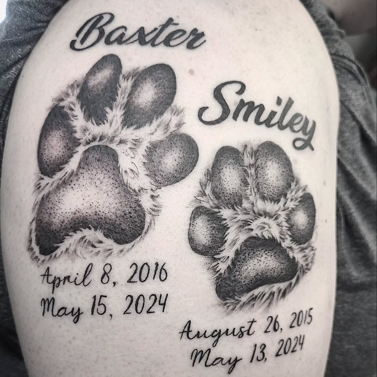 This stunning tattoo beautifully captures the essence of cherished pets, featuring two intricately designed paw prints. Each print is accompanied by names and dates, telling a heartfelt story of companionship and memory. For those considering a similar tribute, think about incorporating personal details that make your tattoo uniquely yours.