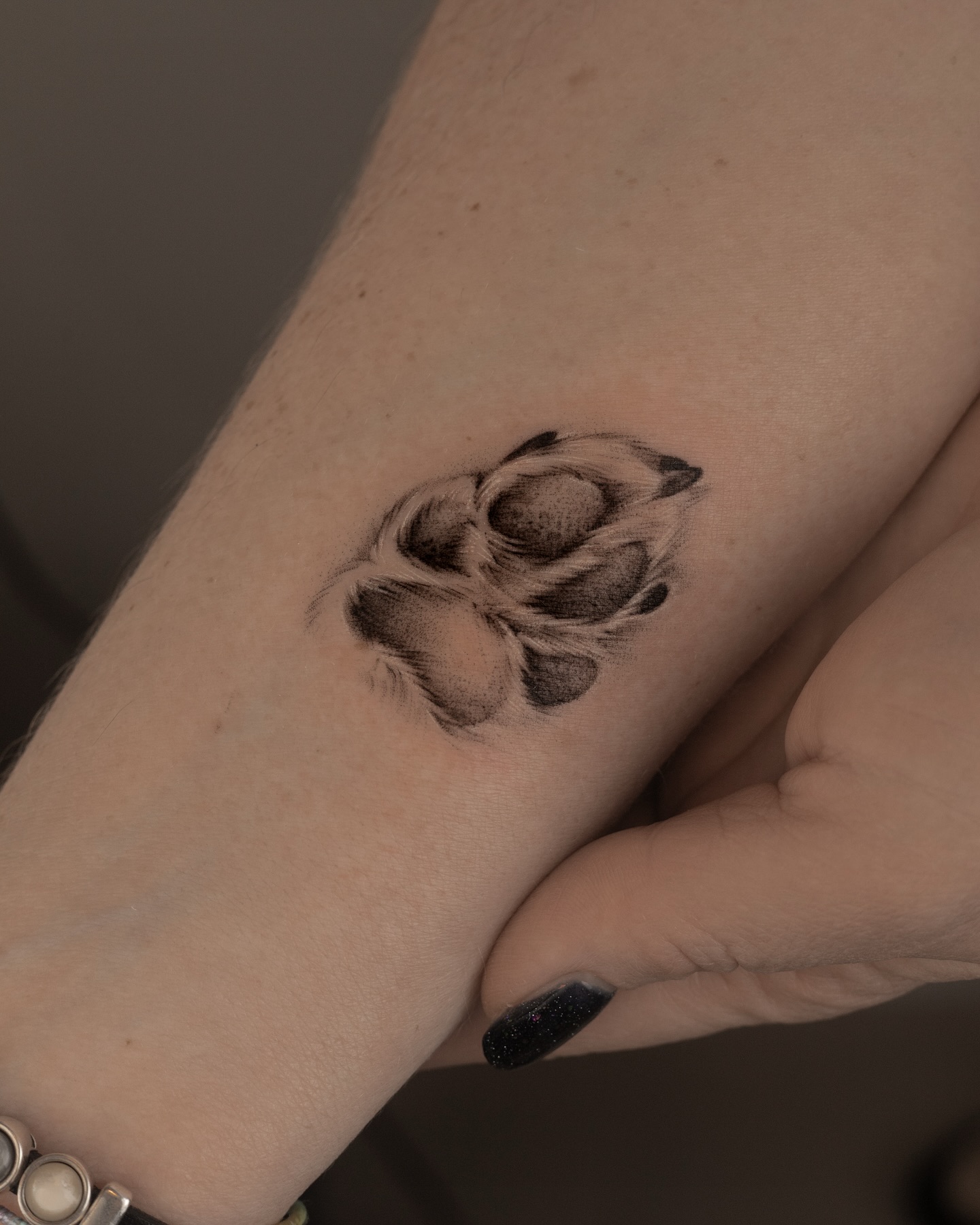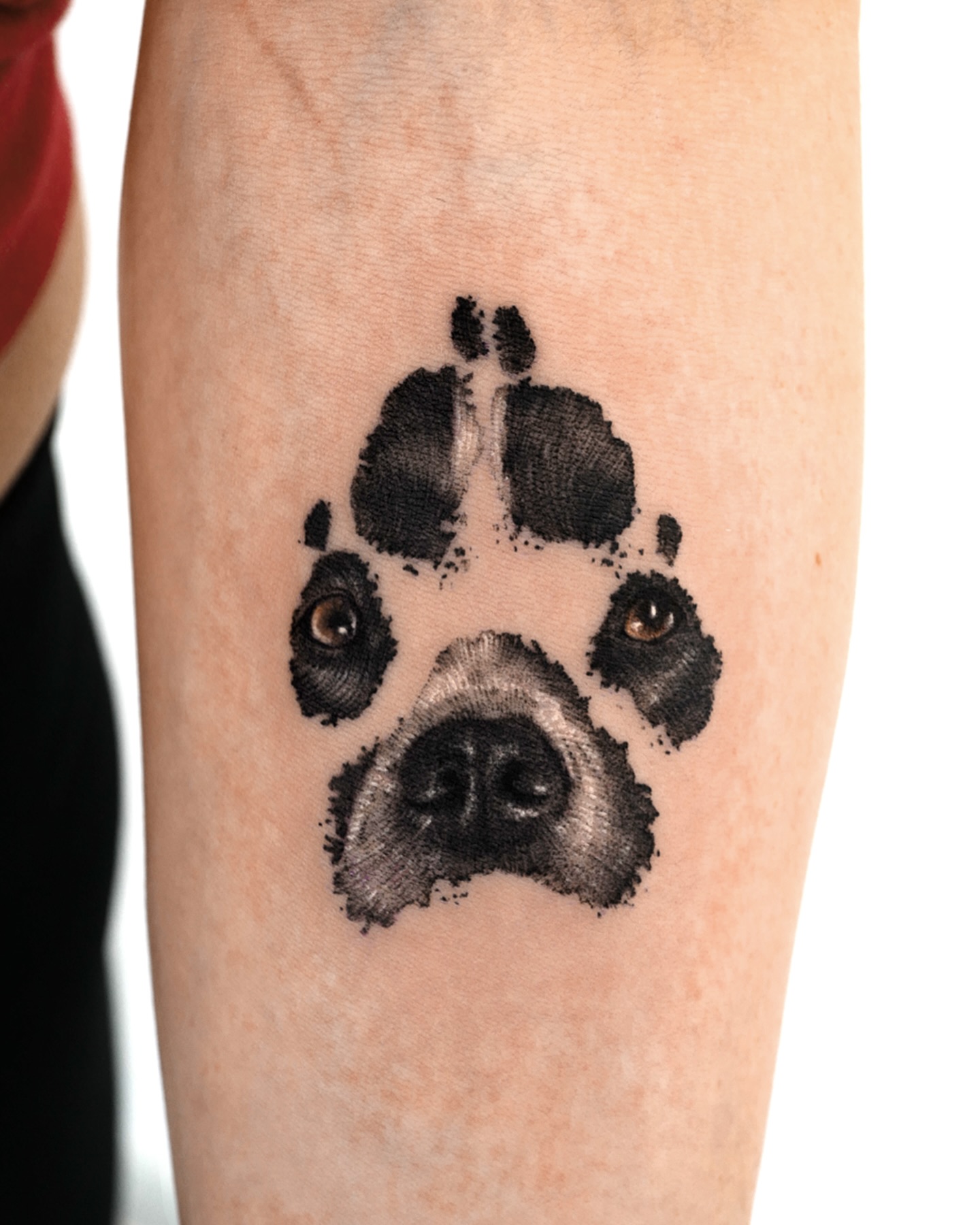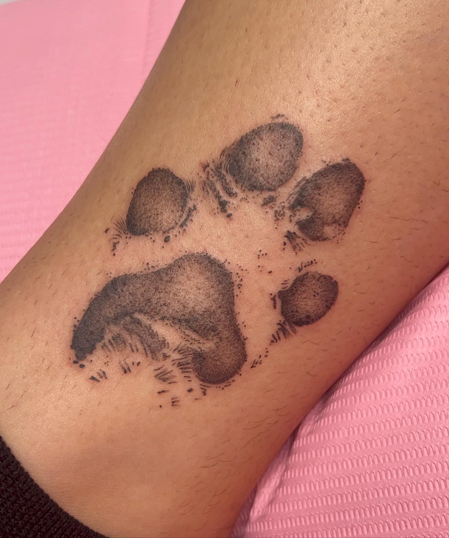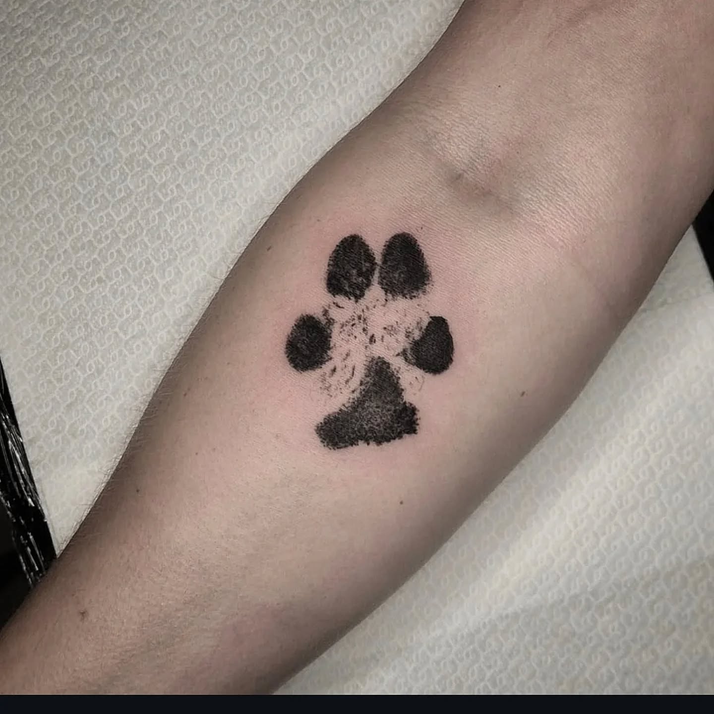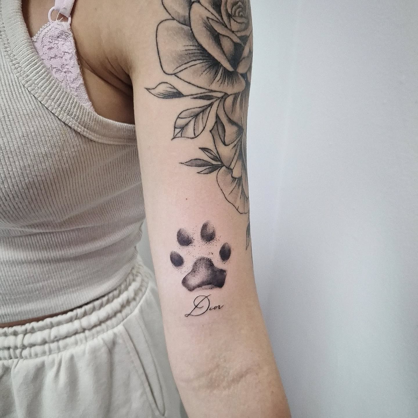 This tattoo captures the essence of a beloved pet with its warm, artistic paw print. The delicate blend of dark ink and soft shading gives it a unique touch, making it a perfect tribute for dog lovers. When choosing a design, consider adding a personal element like a name or a date to make the tattoo even more special.