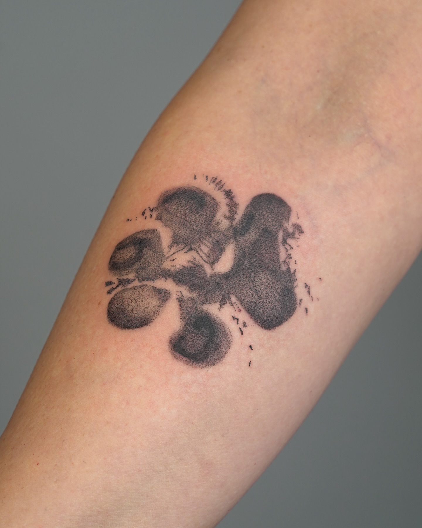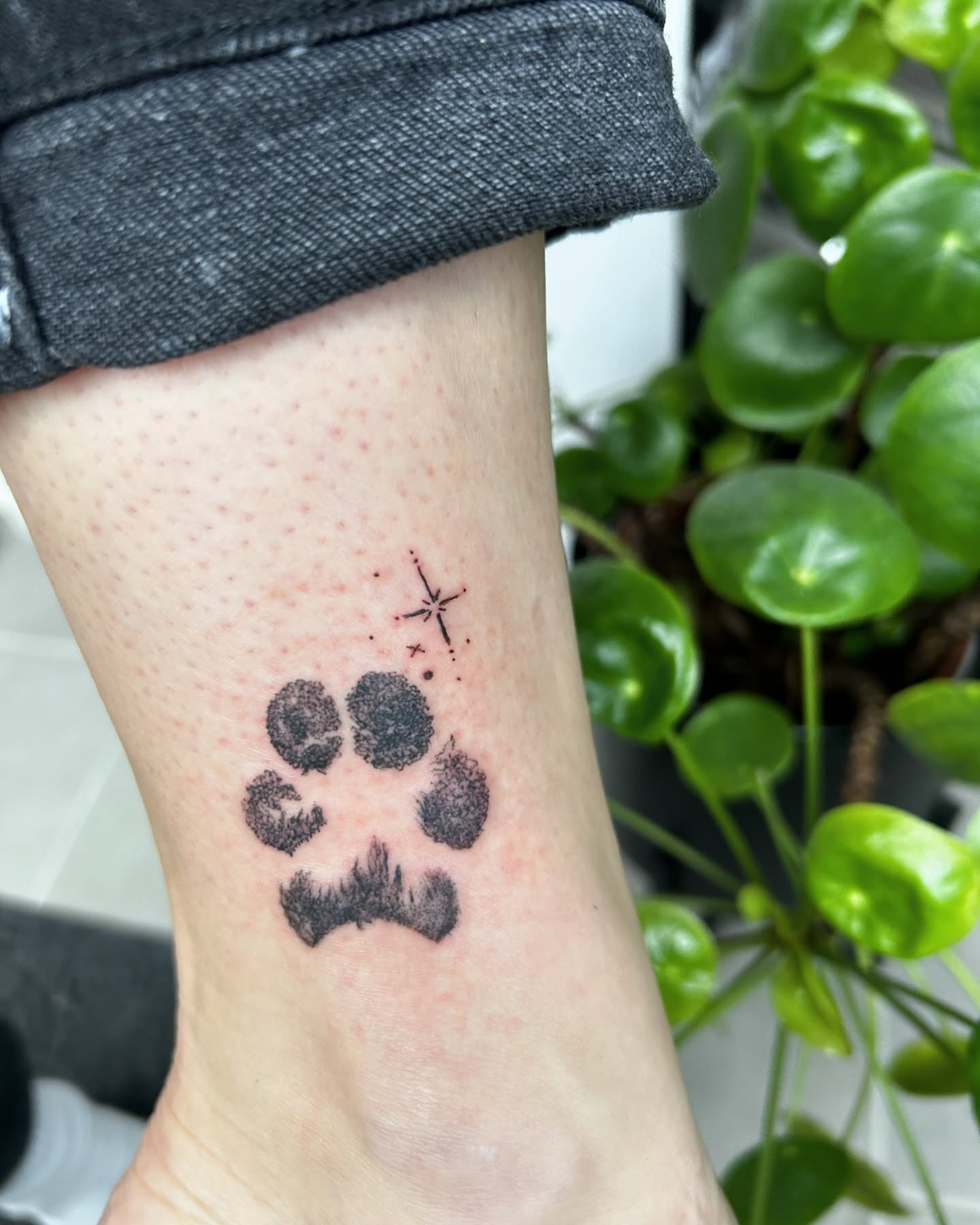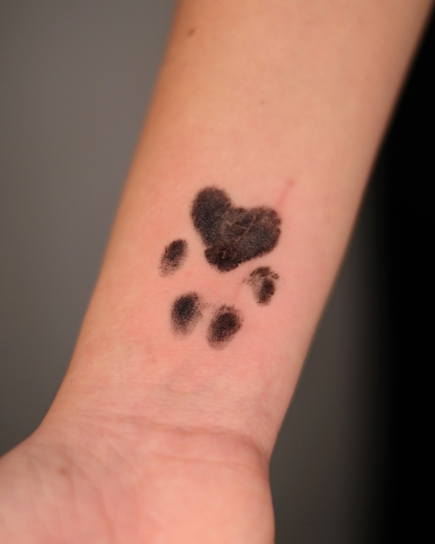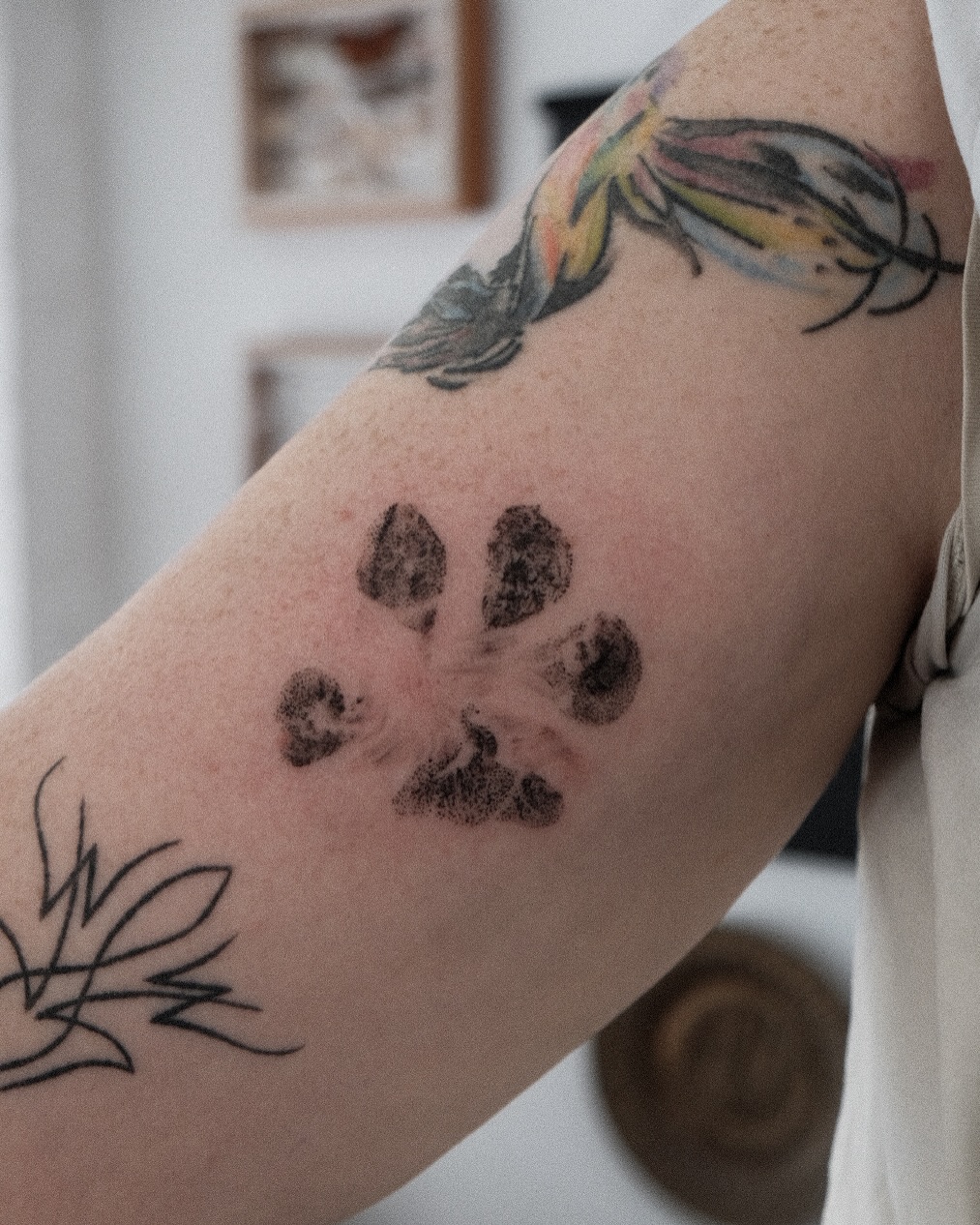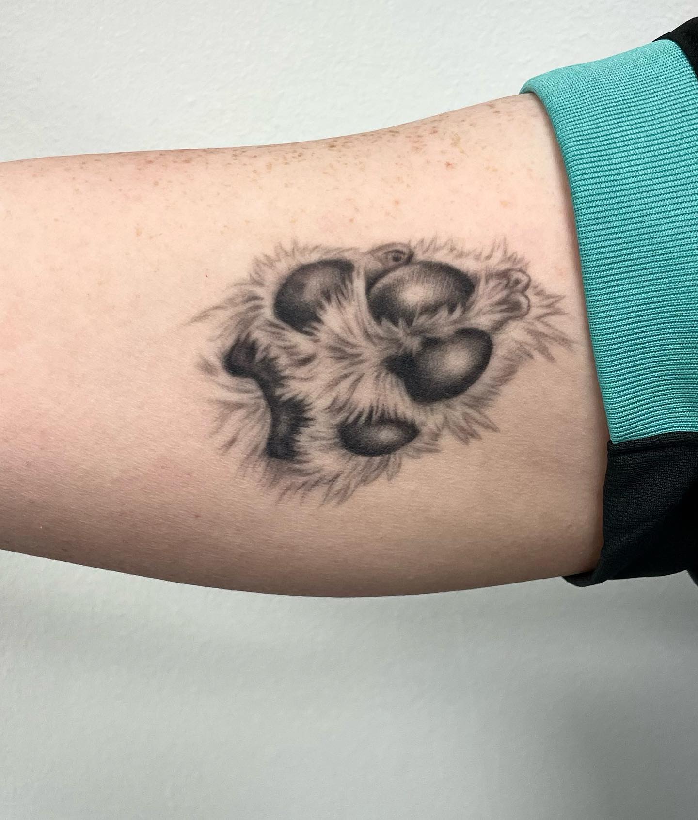 This tattoo captures the essence of a beloved pet with its warm, artistic paw print. The delicate blend of dark ink and soft shading gives it a unique touch, making it a perfect tribute for dog lovers. When choosing a design, consider adding a personal element like a name or a date to make the tattoo even more special.