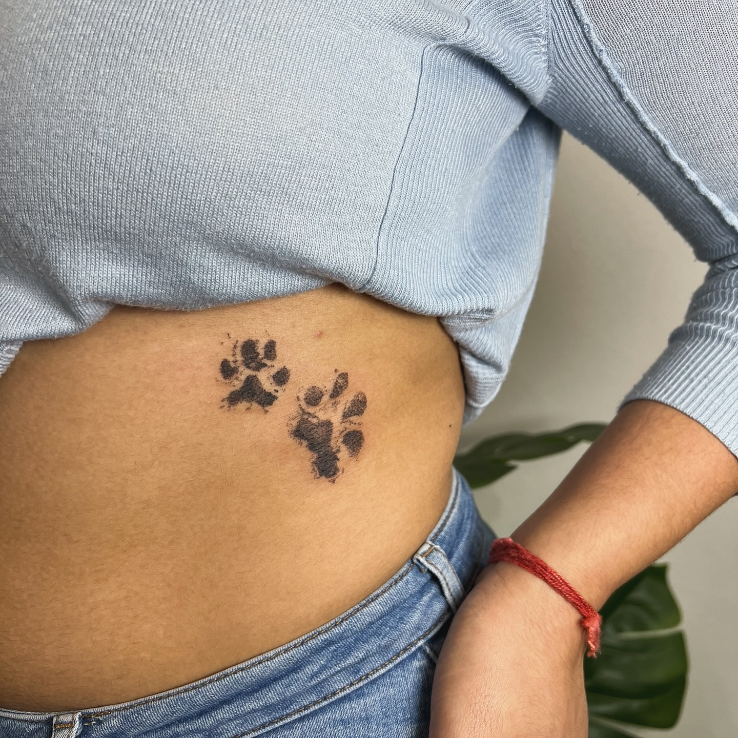 This image showcases a beautiful representation of dog paw tattoos, perfectly placed on the side. The soft outlines and distinct shapes capture a sense of warmth and affection for furry friends. For those considering a similar design, choosing a spot that feels personal can make the tattoo even more meaningful.