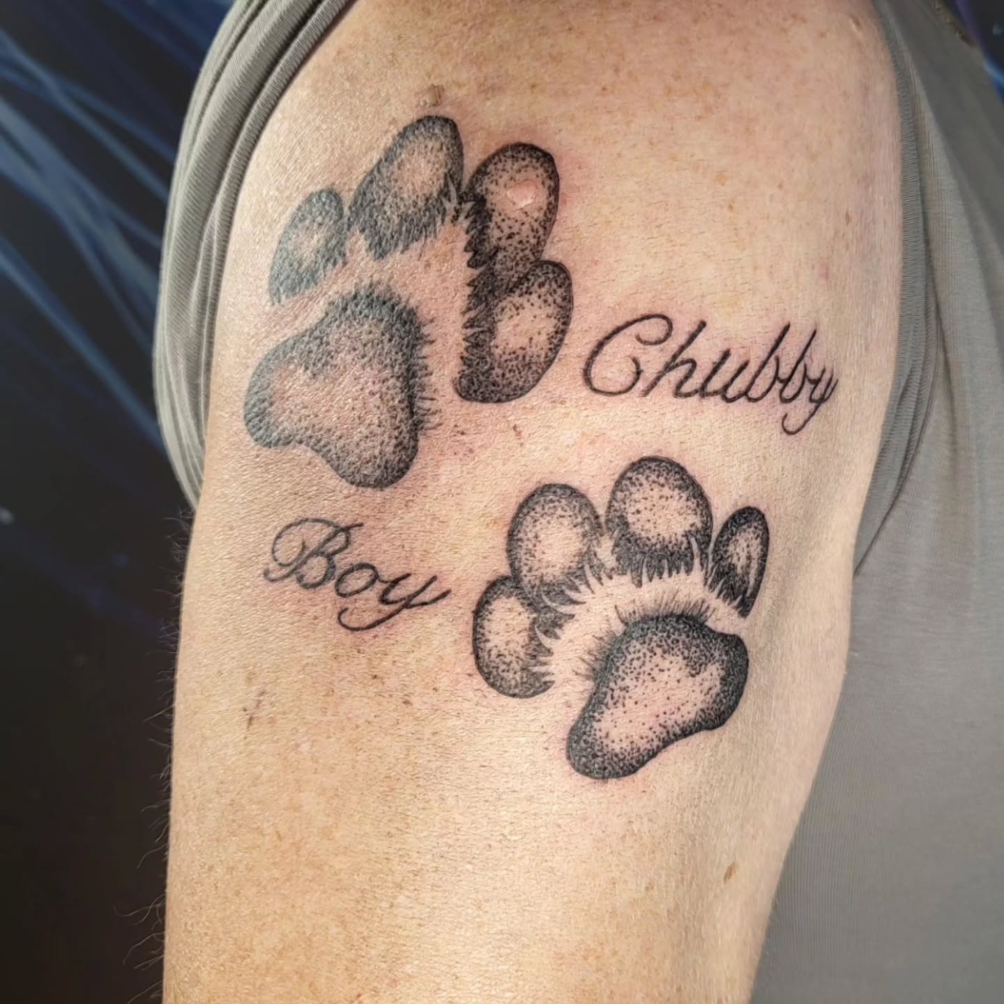 This image features a lovely tribute to a beloved dog, with two adorable paw prints accompanied by the name “Chubby” and the word “Boy.” The detailed shading and soft lines create a warm, heartfelt design that captures the essence of a special bond. For those considering a similar tattoo, personalizing it with a name or a meaningful phrase can make it even more unique and memorable.