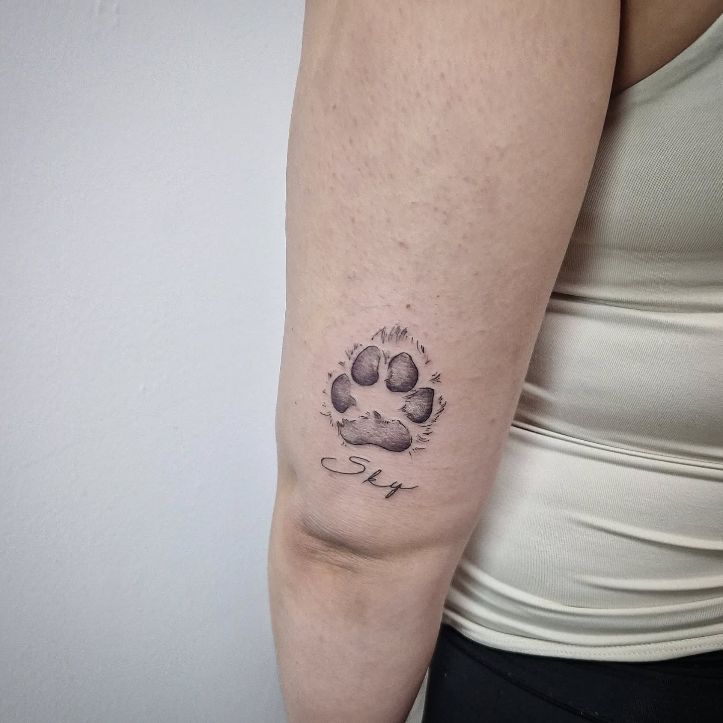 This tattoo features a beautifully detailed paw print, perfectly capturing the essence of a beloved pet. The name “Sky” elegantly accompanies the paw, adding a personal touch that tells a heartwarming story. For those considering a similar design, think about incorporating a special name or date to make it truly unique.