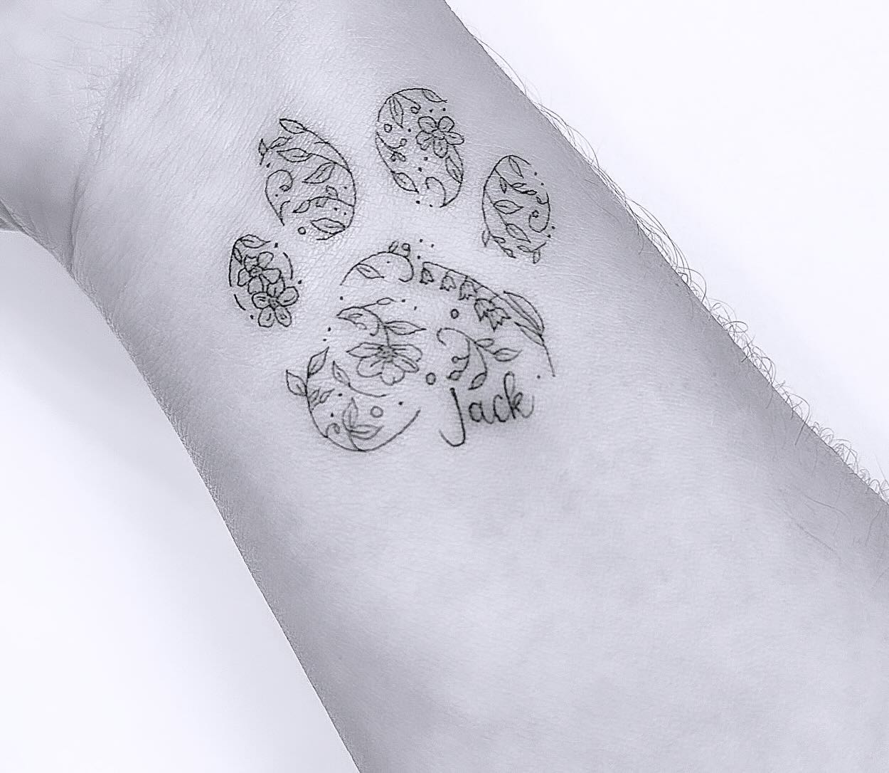 This lovely tattoo showcases a beautifully detailed dog paw print, surrounded by delicate floral patterns. It s a charming tribute to a beloved pet, with the name “Jack” adding a personal touch. When choosing a design, consider incorporating elements that reflect your dog’s personality for a truly unique piece.