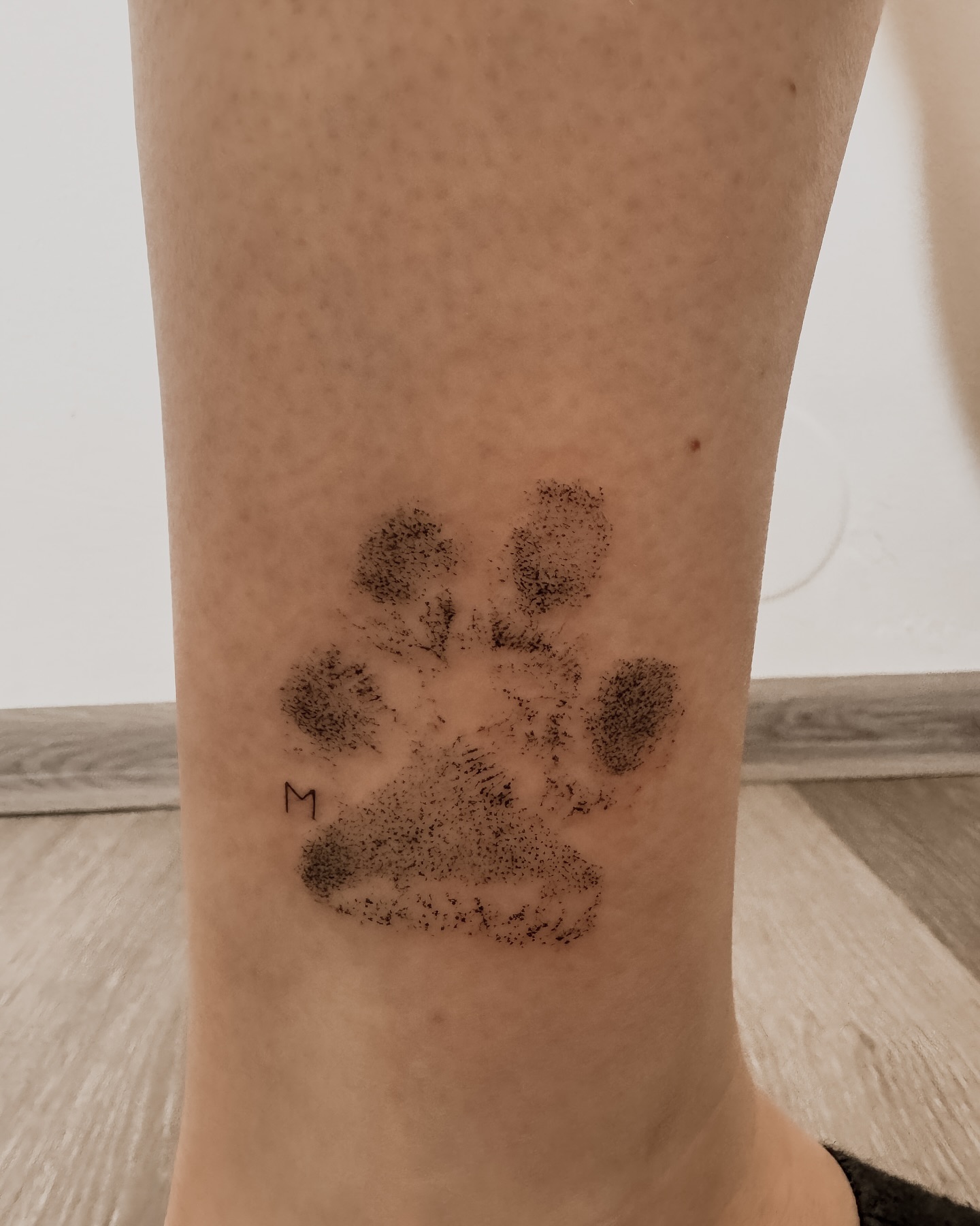 This tattoo beautifully captures the essence of a beloved pet, showcasing a detailed paw print that tells a story of companionship. The unique touch of the initial adds a personal flair, making it not just a tattoo but a heartfelt tribute. For those considering a similar design, think about incorporating elements that reflect your pet’s personality for a more meaningful piece.