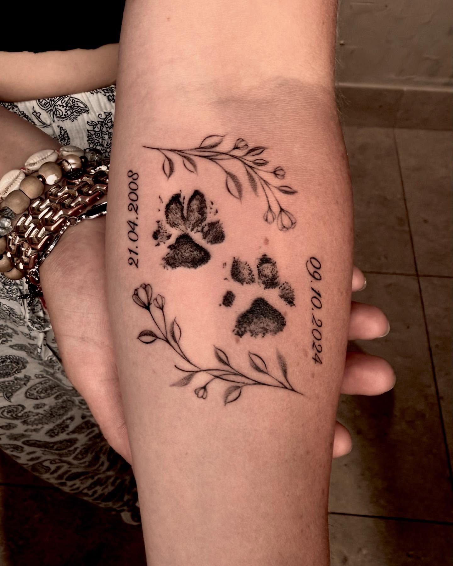 This tattoo beautifully showcases two dog paw prints surrounded by delicate floral elements, creating a heartfelt tribute. The dates etched alongside the paw prints suggest a deep emotional connection, possibly honoring beloved pets. For those considering a similar design, incorporating personal details can make the piece even more meaningful.