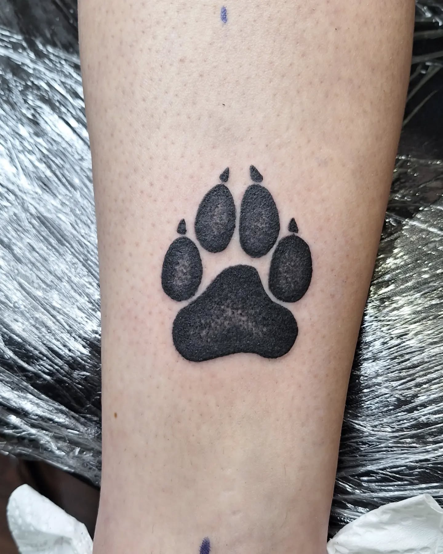 This tattoo showcases a striking paw print that is both bold and beautiful, capturing the essence of a beloved pet. The intricate details and shading give it a lifelike quality, making it a standout piece. For those considering a similar design, choosing a meaningful spot on the body can help make the tattoo even more personal and special.