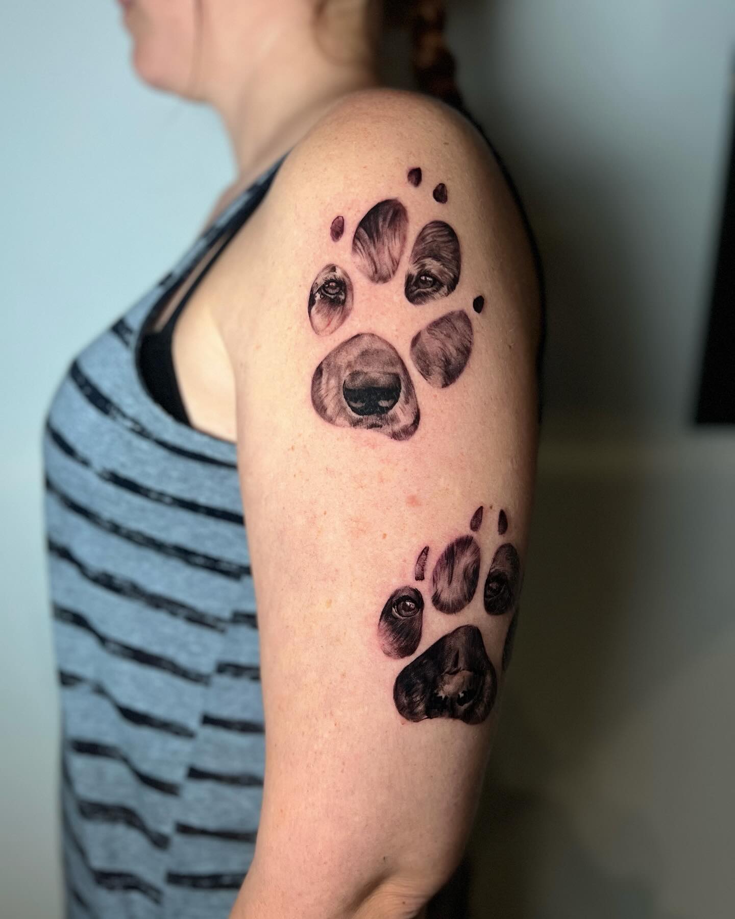 This striking tattoo showcases a unique blend of dog paw prints and the adorable faces of furry friends. It beautifully captures the bond between a woman and her pets, making it a heartfelt expression of love. For those considering similar designs, choosing a tattoo artist skilled in realism can make all the difference in bringing your vision to life.