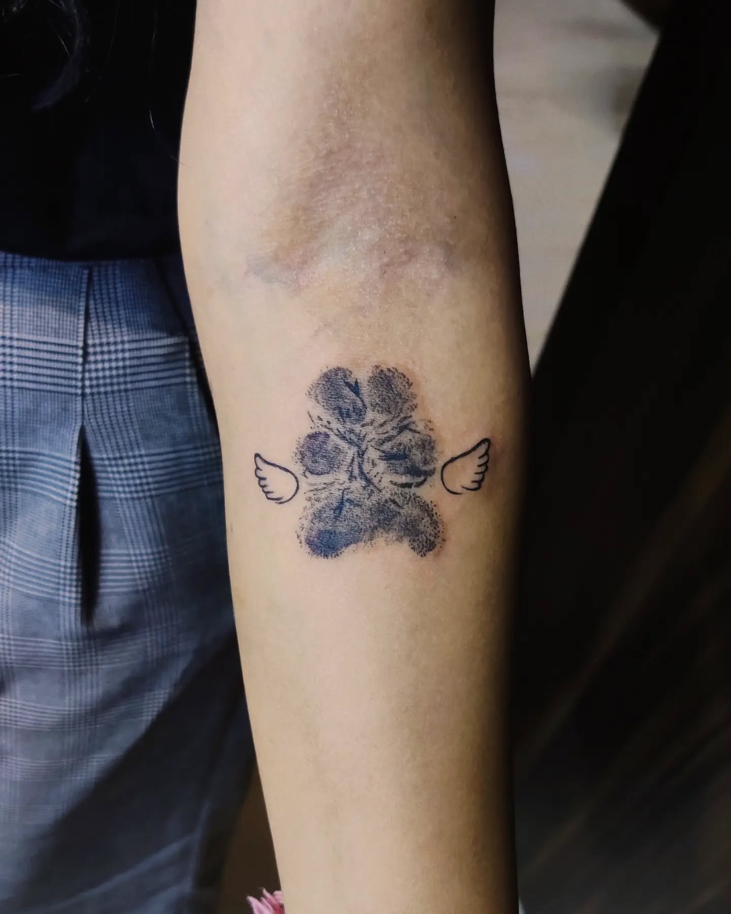 This tattoo beautifully combines a dog paw print with delicate wings, showcasing a unique blend of love for pets and a touch of whimsy. It symbolizes freedom and the special bond between a woman and her furry friend. Choosing a design that reflects personal stories can make the tattoo even more meaningful.